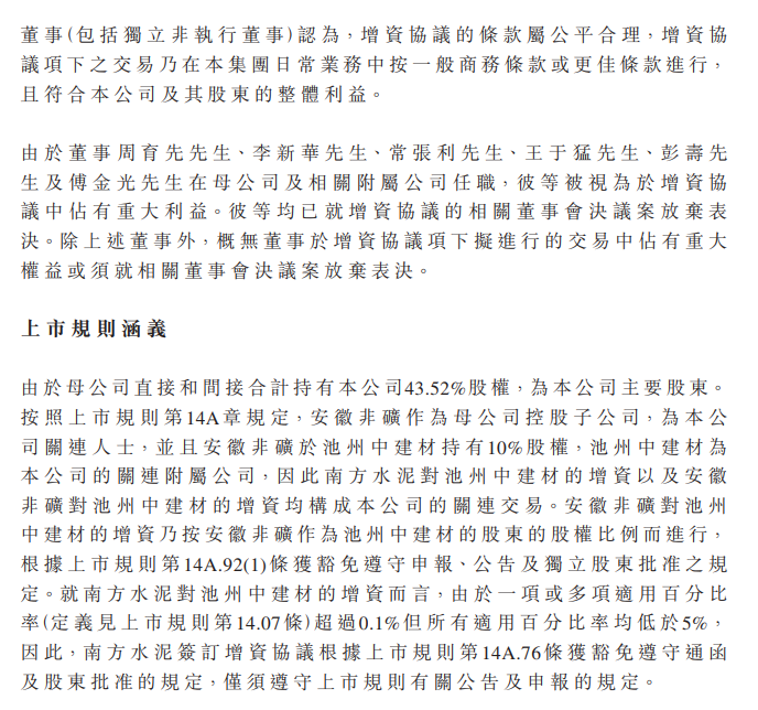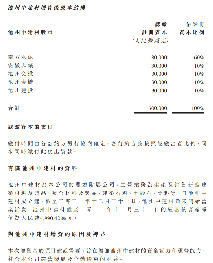 據悉,池州中建材為該公司的關聯附屬公司,主營業務為生產及銷售新型建筑材料及制品、復合材料及制品、建筑石料、土砂石、骨料等。本次增資基于項目建設需要,旨在增強池州中建材的資金實力和運營能力,符合公司經營發展及全體股東的利益。