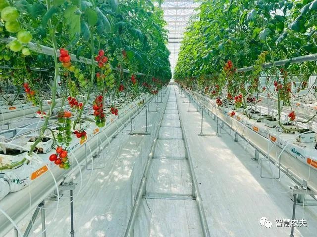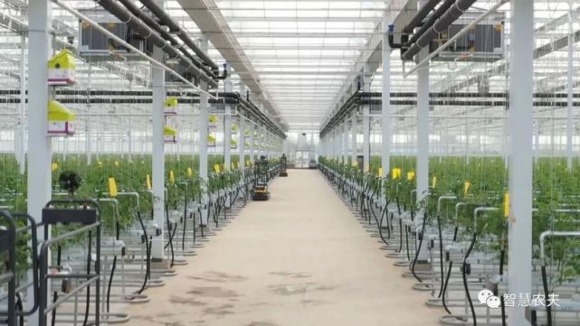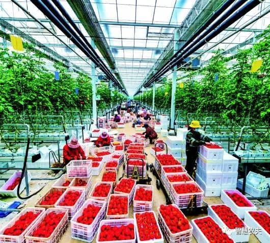 在溫室內(nèi)碧綠的番茄長得郁郁蔥蔥,長長的懸掛式鋼絲蔓繩,有利于作物攀爬生長,增加產(chǎn)量。成排的管道通往室內(nèi)各個方向,筆直的采摘軌道,既用來運載采摘車,也用來傳遞余熱轉(zhuǎn)化成的熱水或者冷水。番茄生長每一個環(huán)節(jié)都依托大數(shù)據(jù)云計算自動采集、監(jiān)測、分析農(nóng)作物生長環(huán)境信息,并利用物聯(lián)網(wǎng)技術(shù),精準(zhǔn)調(diào)控棚內(nèi)的溫度、濕度、施肥量、澆水量等,科學(xué)調(diào)節(jié)農(nóng)作物生命規(guī)律,延長生長周期,實現(xiàn)智慧化管理、標(biāo)準(zhǔn)化生產(chǎn)。