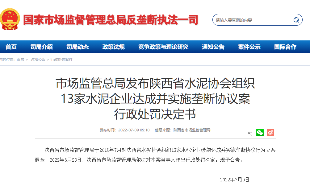 日前,市場監管總局發布陜西省水泥協會組織13家水泥企業達成并實施壟斷協議案行政處罰決定書稱,陜西省市場監督管理局于2019年7月對陜西省水泥協會組織13家水泥企業涉嫌達成并實施壟斷協議行為立案調查。2022年6月28日,陜西省市場監督管理局依法對本案當事人作出行政處罰決定。現予公告。