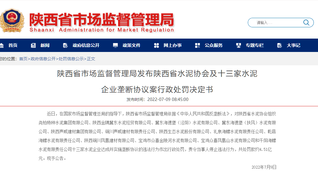 陜西省市場監督管理局發布陜西省水泥協會及十三家水泥企業壟斷協議案行政處罰決定書稱,近日,在國家市場監督管理總局的指導下,陜西省市場監督管理局依據《中華人民共和國反壟斷法》,對陜西省水泥協會組織堯柏特種水泥集團有限公司、陜西金隅冀東水泥經貿有限公司、冀東海德堡(涇陽)水泥有限公司、冀東海德堡(扶風)水泥有限公司、陜西聲威建材集團有限公司、銅川聲威建材有限責任公司、陜西生態水泥股份有限公司、禮泉海螺水泥有限責任公司、乾縣海螺水泥有限責任公司、陜西銅川鳳凰建材有限公司、寶雞市眾喜金陵河水泥有限公司、寶雞眾喜鳳凰山水泥有限公司和千陽海螺水泥有限責任公司十三家水泥企業達成并實施壟斷協議的違法行為作出行政處罰,責令當事人停止違法行為,共處罰款約4.51億元。現予公告。
