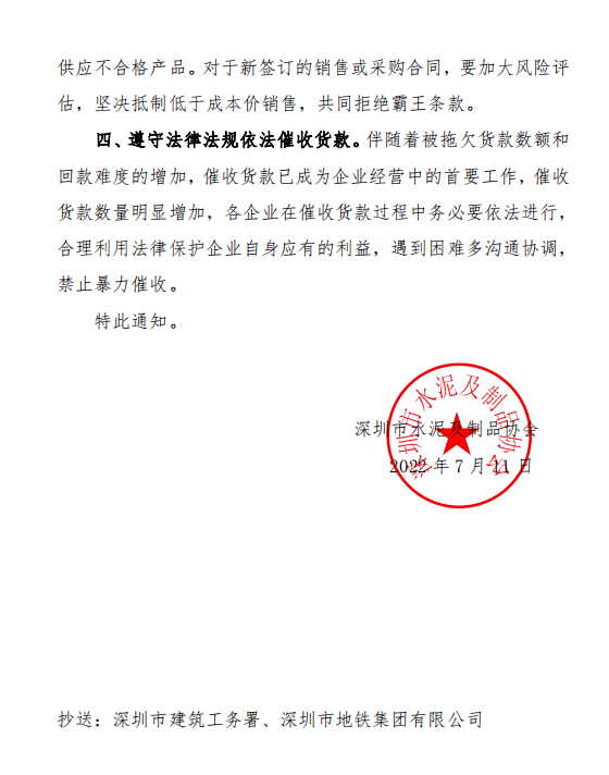 日前,深圳市水泥及制品協會關于發布預拌混凝土市場和質量風險預警的通知給各預拌混凝土生產企業稱,根據前期數據統計及走訪調研結果,深圳市預拌混凝土生產企業普遍面臨銷售成交價格偏低、應收難收貨款偏高、追討應收貨款阻力大、新中標價格持續偏低等問題。