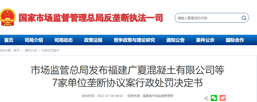2022年6月8日,福建省市場監督管理局依法對福建廣夏混凝土有限公司、杭德(建陽)混凝土有限公司、南平市建陽區華盛混凝土有限公司、福建省武夷建達混凝土有限公司、福建武夷瀝青混凝土有限公司、南平市建陽區永固混凝土有限公司、福建省云信混凝土有限公司等7家混凝土企業作出行政處罰決定共處罰款1582.9萬元。