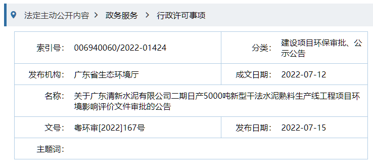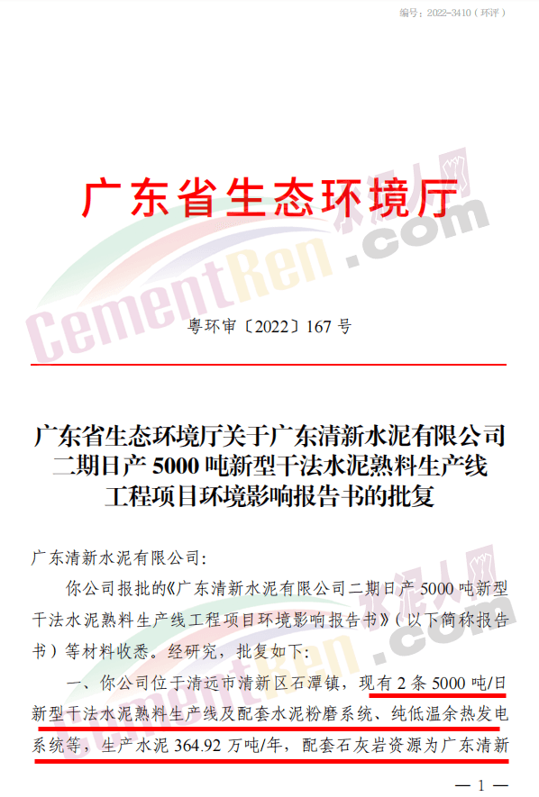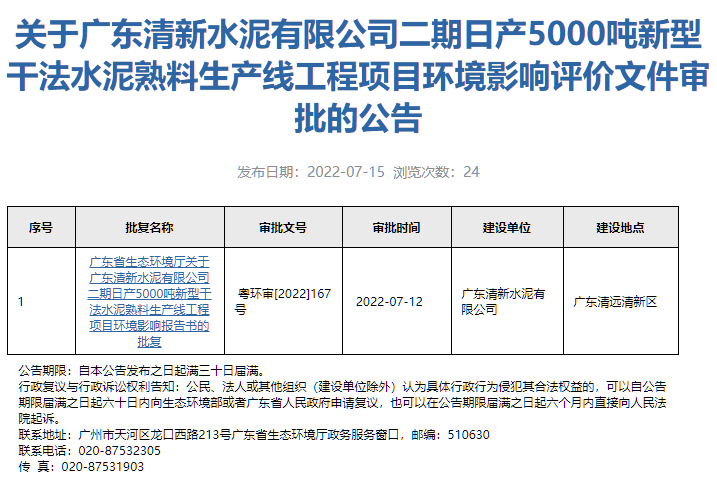 日前,廣東生態(tài)環(huán)境廳發(fā)布《關于廣東清新水泥有限公司二期日產(chǎn)5000噸新型干法水泥熟料生產(chǎn)線工程項目環(huán)境影響評價文件審批的公告》提到廣東清新水泥有限公司報批的《廣東清新水泥有限公司二期日產(chǎn) 5000 噸新型干法水泥熟料生產(chǎn)線工程項目環(huán)境影響報告書》(以下簡稱報告書)等材料收悉。