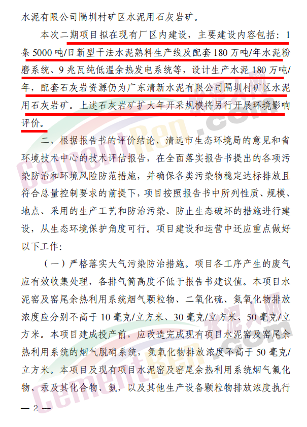 本次二期項目擬在現(xiàn)有廠區(qū)內(nèi)建設,主要建設內(nèi)容包括:1條 5000 噸/日新型干法水泥熟料生產(chǎn)線及配套 180 萬噸/年水泥粉磨系統(tǒng)、9 兆瓦純低溫余熱發(fā)電系統(tǒng)等,設計生產(chǎn)水泥 180 萬噸/年,配套石灰?guī)r資源仍為廣東清新水泥有限公司隔圳村礦區(qū)水泥用石灰?guī)r礦。上述石灰?guī)r礦擴大年開采規(guī)模將另行開展環(huán)境影響評價。