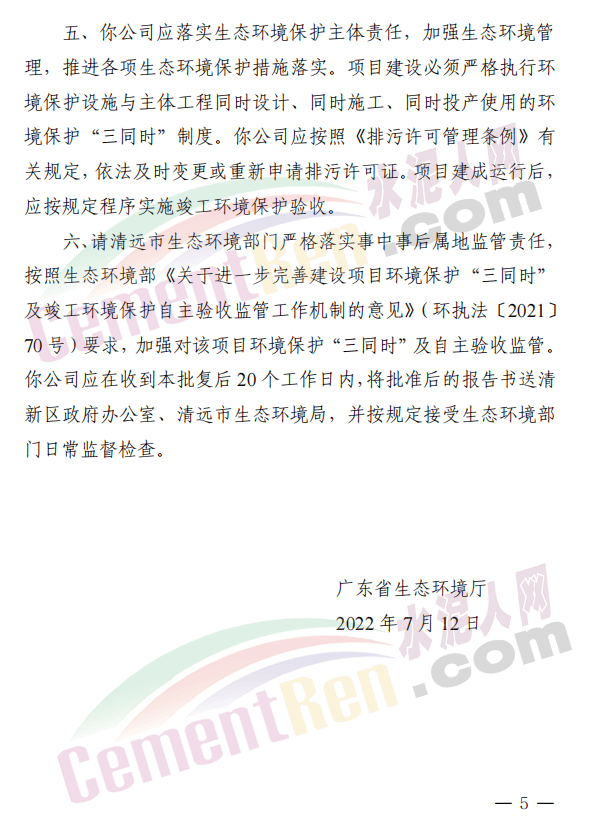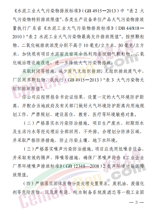 (一)嚴格落實大氣污染防治措施。項目各工序產(chǎn)生的廢氣應有效收集處理,各排氣筒高度不低于報告書建議值。本項目水泥窯及窯尾余熱利用系統(tǒng)煙氣顆粒物、二氧化硫、氮氧化物排放濃度應分別不高于 10 毫克/立方米、30 毫克/立方米、50 毫克/立方米。