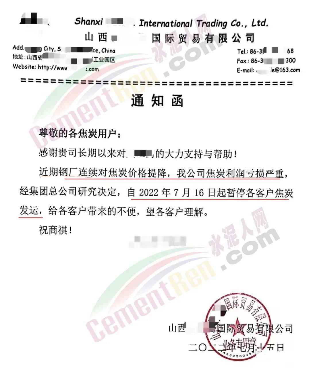 同期,有焦化廠通知函稱,近期鋼廠連續(xù)對焦炭價格提降,公司焦炭利潤虧損嚴重,經(jīng)集團總公司研究決定,自7月16日起暫停各客戶焦炭發(fā)運。