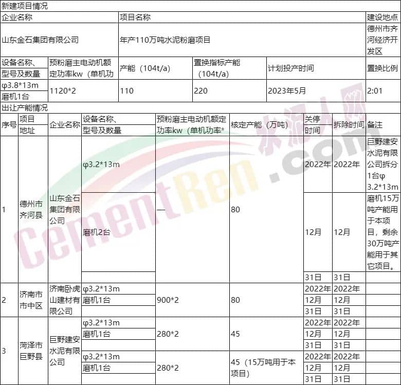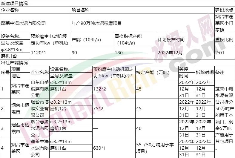 年產(chǎn)90萬噸水泥粉磨項目產(chǎn)能置換情況表