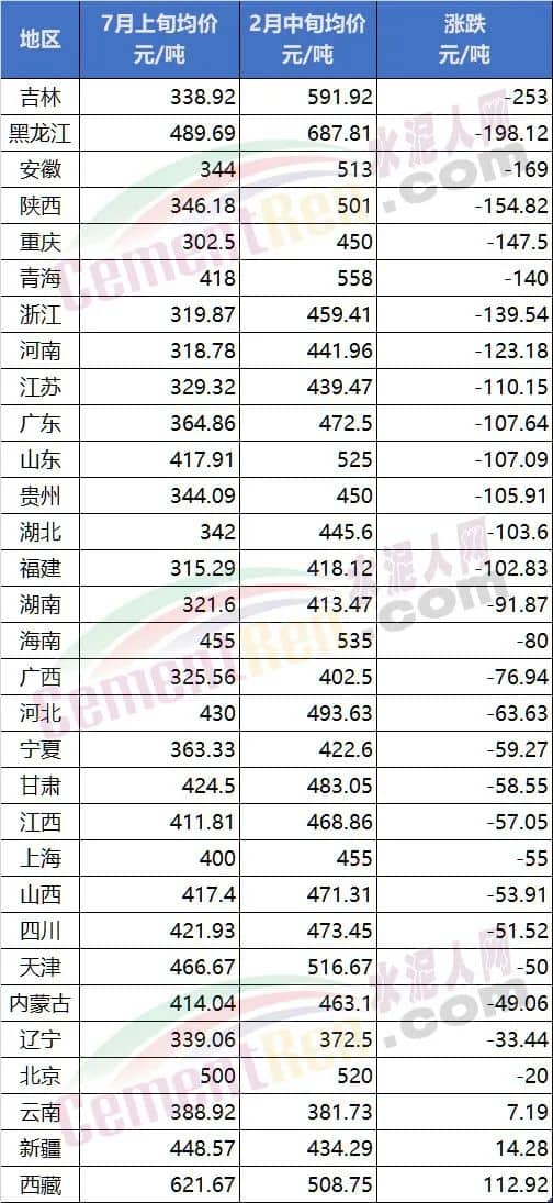 從上述數據可見,自2022年春節以來,31個省市自治區中,除云南、新疆、西藏3個區域外,其余29個區域均處于下跌狀態。據水泥人網信息中心重點監控的600多家水泥企業P.O42.5散裝水泥報價,7月初,重慶、安徽、河南、吉林、浙江、廣西、貴州、遼寧、福建、湖南等10多個省市地區絕大多數企業報價已跌至300元/噸以下。