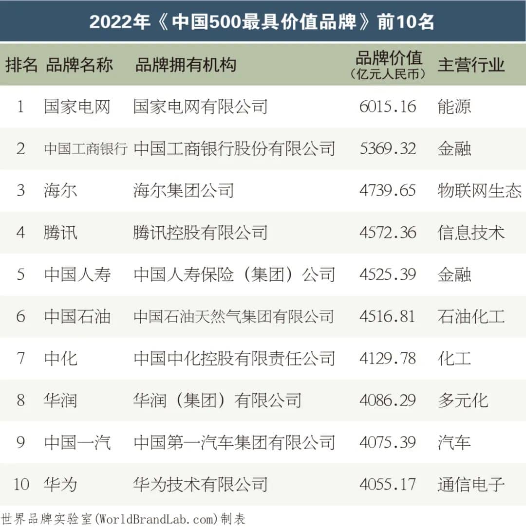 由世界品牌實(shí)驗(yàn)室(World Brand Lab)主辦的(第十九屆)“世界品牌大會(huì)”于7月26日在北京舉行,會(huì)上發(fā)布了2022年《中國(guó)500最具價(jià)值品牌》分析報(bào)告。在這份基于財(cái)務(wù)數(shù)據(jù)、品牌強(qiáng)度和消費(fèi)者行為分析的年度報(bào)告中,國(guó)家電網(wǎng)以6015.16億元的品牌價(jià)值榮登本年度最具價(jià)值品牌榜首。占據(jù)榜單前五名的還有中國(guó)工商銀行(5369.32億元)、海爾(4739.65億元)、騰訊(4572.36億元)、中國(guó)人壽(4525.39億元),這些品牌已經(jīng)邁進(jìn)世界級(jí)品牌陣營(yíng)。來自哈佛、耶魯、牛津、歐洲工商管理學(xué)院、倫敦大學(xué)學(xué)院的管理大師們出席了“世界品牌大會(huì)”并做在線演講,圍繞“氣與勢(shì):如何重建品牌生態(tài)系統(tǒng)”的大會(huì)主題與現(xiàn)場(chǎng)嘉賓互動(dòng)研討。