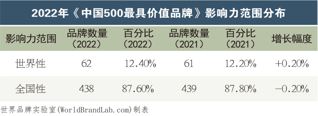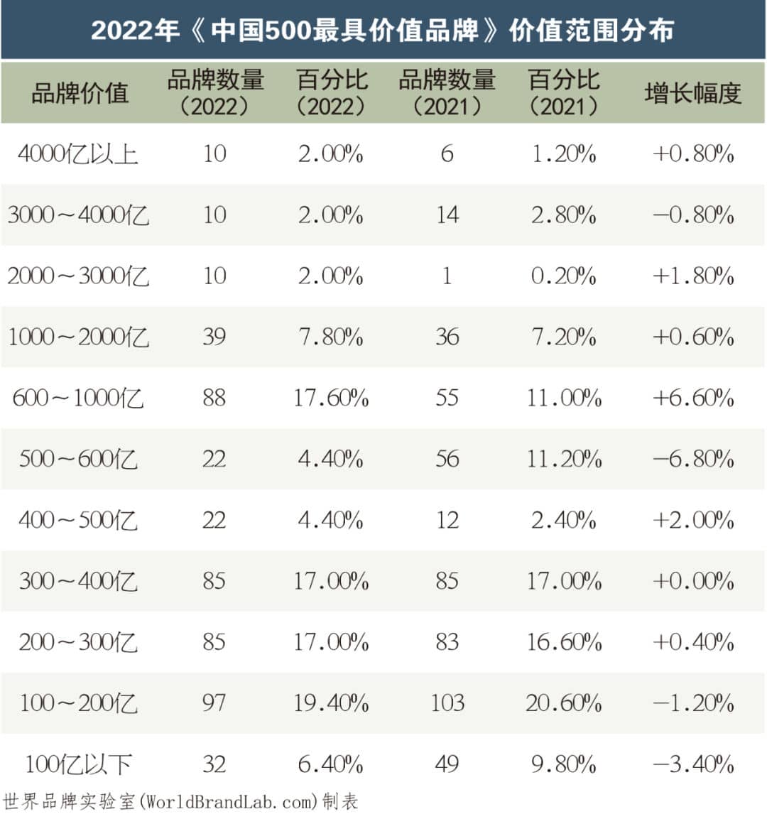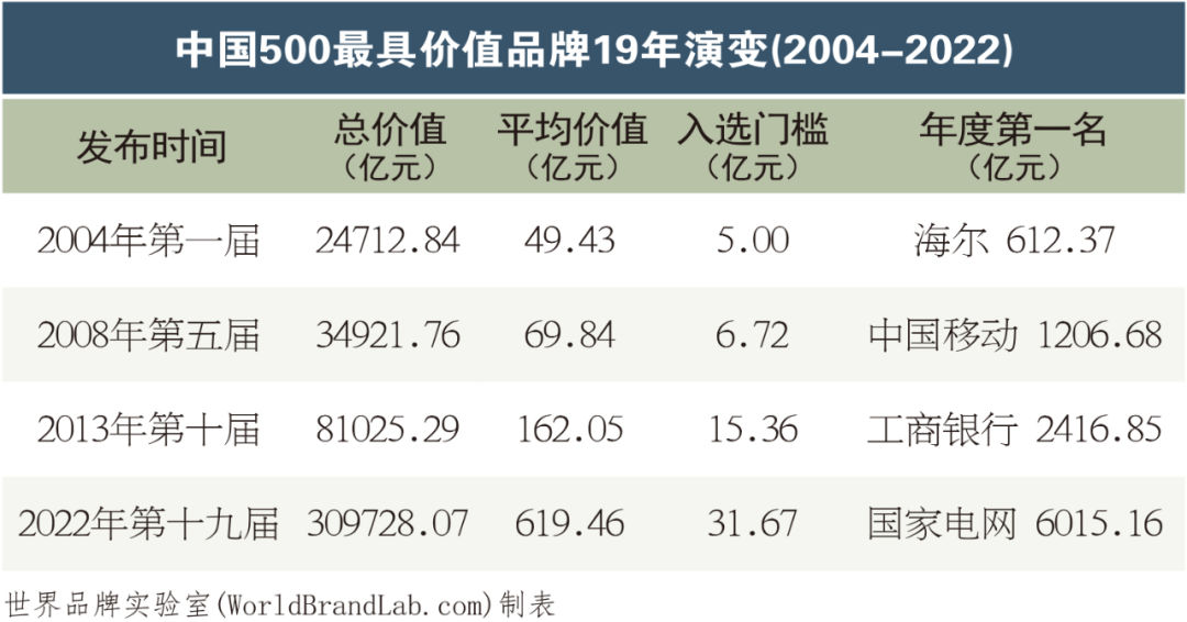 2022年《中國(guó)500最具價(jià)值品牌》的總價(jià)值為309728.07億元,比去年增加30774.87億元,增加幅度為11.03%。世界品牌實(shí)驗(yàn)室學(xué)術(shù)委員會(huì)主席、牛津大學(xué)(Oxford)營(yíng)銷學(xué)榮譽(yù)教授斯蒂芬·沃格(Steve Woolgar)表示:“品牌是一個(gè)國(guó)家的形象,我希望世界上更多的人能夠通過中國(guó)品牌了解中國(guó)的故事。在過去的17年中,我目睹了中國(guó)品牌的快速成長(zhǎng),有的已經(jīng)具有強(qiáng)大的世界影響力”。世界品牌實(shí)驗(yàn)室編制中國(guó)品牌報(bào)告已是第19個(gè)年頭,2004年入選門檻僅為5億元,前500名品牌的平均價(jià)值為49.43億元。19年以后的2022年,入選門檻已經(jīng)提高到31.67億元,而前500名品牌的平均價(jià)值高達(dá)619.46億元,增加幅度為1153.21%。