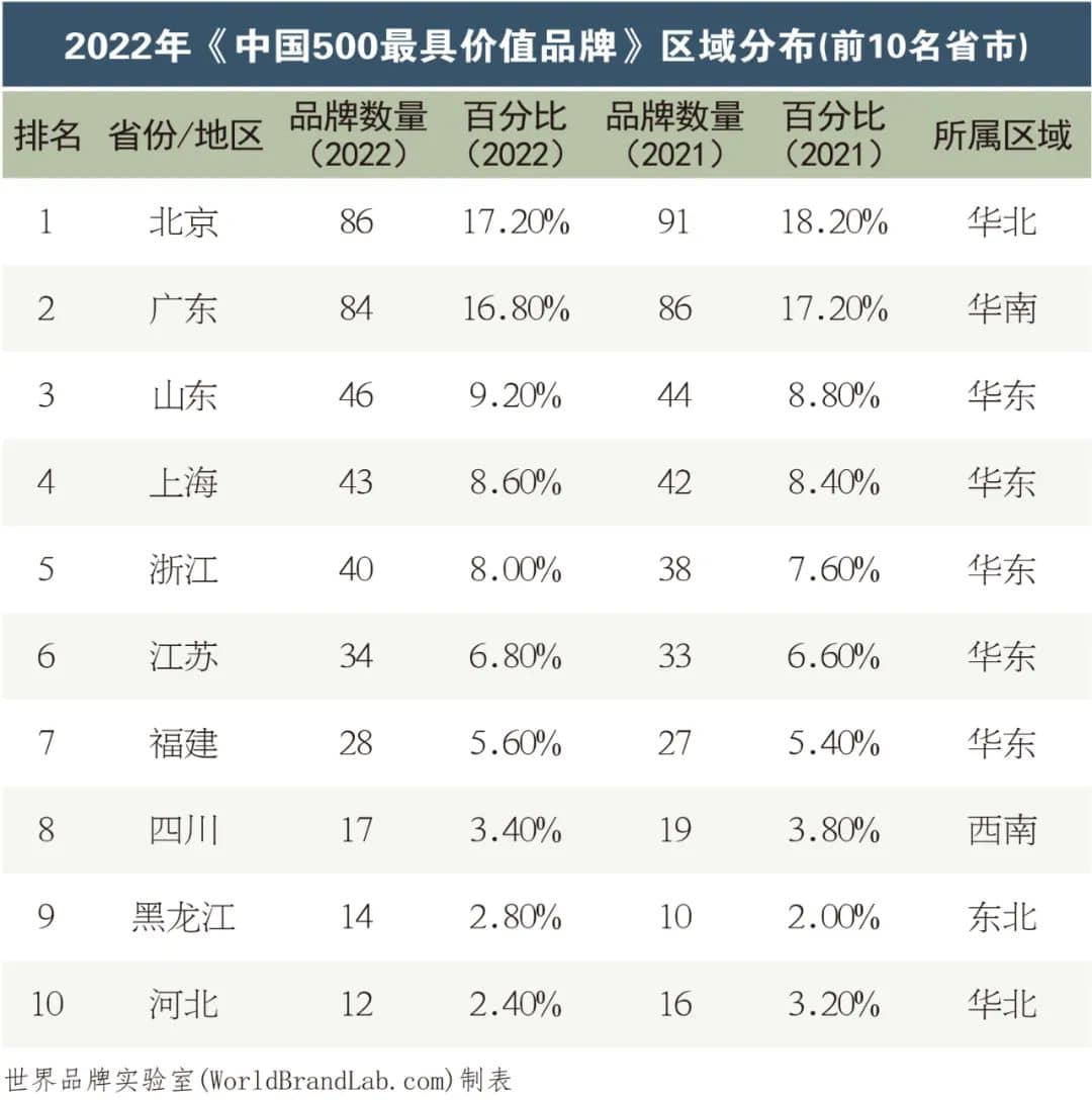 據(jù)世界品牌實(shí)驗(yàn)室分析,一個(gè)區(qū)域的競(jìng)爭(zhēng)實(shí)力,主要取決于其比較優(yōu)勢(shì),而品牌效益直接影響著地區(qū)比較優(yōu)勢(shì)的形成和發(fā)展。品牌是一個(gè)地區(qū)發(fā)展的重要標(biāo)志,品牌帶動(dòng)區(qū)域經(jīng)濟(jì)的增長(zhǎng),區(qū)域經(jīng)濟(jì)的發(fā)展又促進(jìn)當(dāng)?shù)仄放频某砷L(zhǎng)。從本屆《中國(guó)500最具價(jià)值品牌》區(qū)域分布來看,北京有86個(gè)品牌入選,名列第一,主要原因是贏利能力強(qiáng)的央企總部集中在北京;廣東和山東分別有84個(gè)和46個(gè)品牌入選,位居第二和第三。根據(jù)入選品牌影響力范圍大小,可按照全國(guó)性、世界性品牌進(jìn)行劃分。榜單中具有全國(guó)范圍影響力的品牌有438個(gè),占87.60%;具有世界性影響力的品牌數(shù)為62個(gè),占12.40%,比去年略有增加。