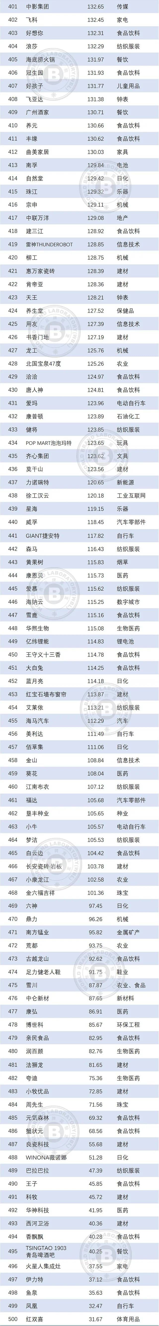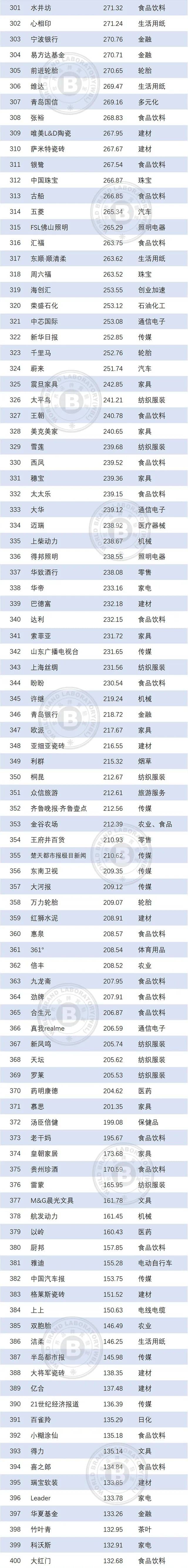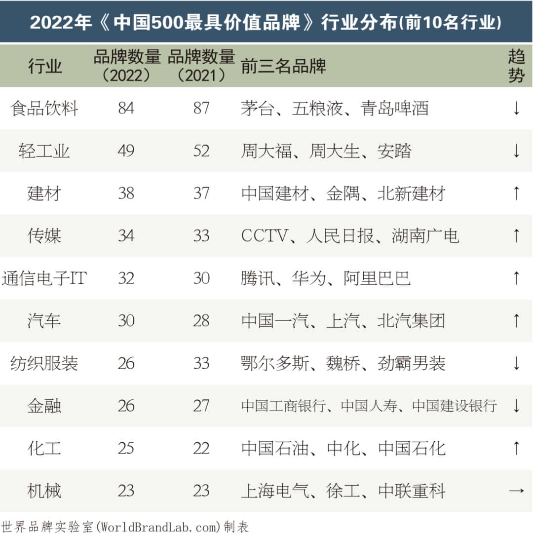 盡管新冠疫情沒有阻擋中國(guó)品牌價(jià)值整體上升的趨勢(shì),但是與去年相比,航空、旅游服務(wù)、紡織服裝、地產(chǎn)、零售等受疫情影響大的行業(yè)入榜品牌數(shù)量均出現(xiàn)下降,而汽車、通信電子IT、農(nóng)業(yè)等行業(yè)入榜品牌均有不同程度增加。本年度《中國(guó)500最具價(jià)值品牌》排行榜中,共有來自食品飲料、輕工業(yè)、建材、傳媒、紡織服裝、醫(yī)藥、機(jī)械等在內(nèi)的25個(gè)相關(guān)行業(yè)的品牌入選。其中食品飲料業(yè)依然是入選品牌最多的行業(yè),共有84個(gè)品牌入選,占總?cè)脒x品牌數(shù)的16.80%;入選數(shù)量位居第二到第五的行業(yè)分別是輕工(49個(gè))、建材(38個(gè))、傳媒(34個(gè))、通信電子IT(32個(gè))。本年度共有69個(gè)中國(guó)品牌的價(jià)值超過1000億,比去年增加了12個(gè)。