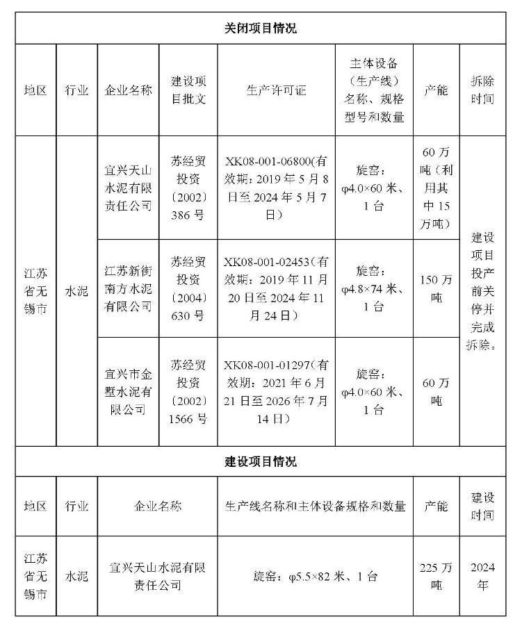 7月26日,江蘇省工信廳發布《關于宜興天山水泥有限責任公司水泥熟料生產線建設方案的公示》。公示內容顯示,宜興天山水泥有限責任公司通過退出宜興天山水泥有限責任公司、江蘇新街南方水泥有限公司、宜興市金墅水泥有限公司各一條熟料生產線產能,在宜興市楊巷鎮綠色建材產業園新建1條水泥熟料生產線,生產線窯規格為5.5×82米,產能225萬噸/年,建設時間為2024年。