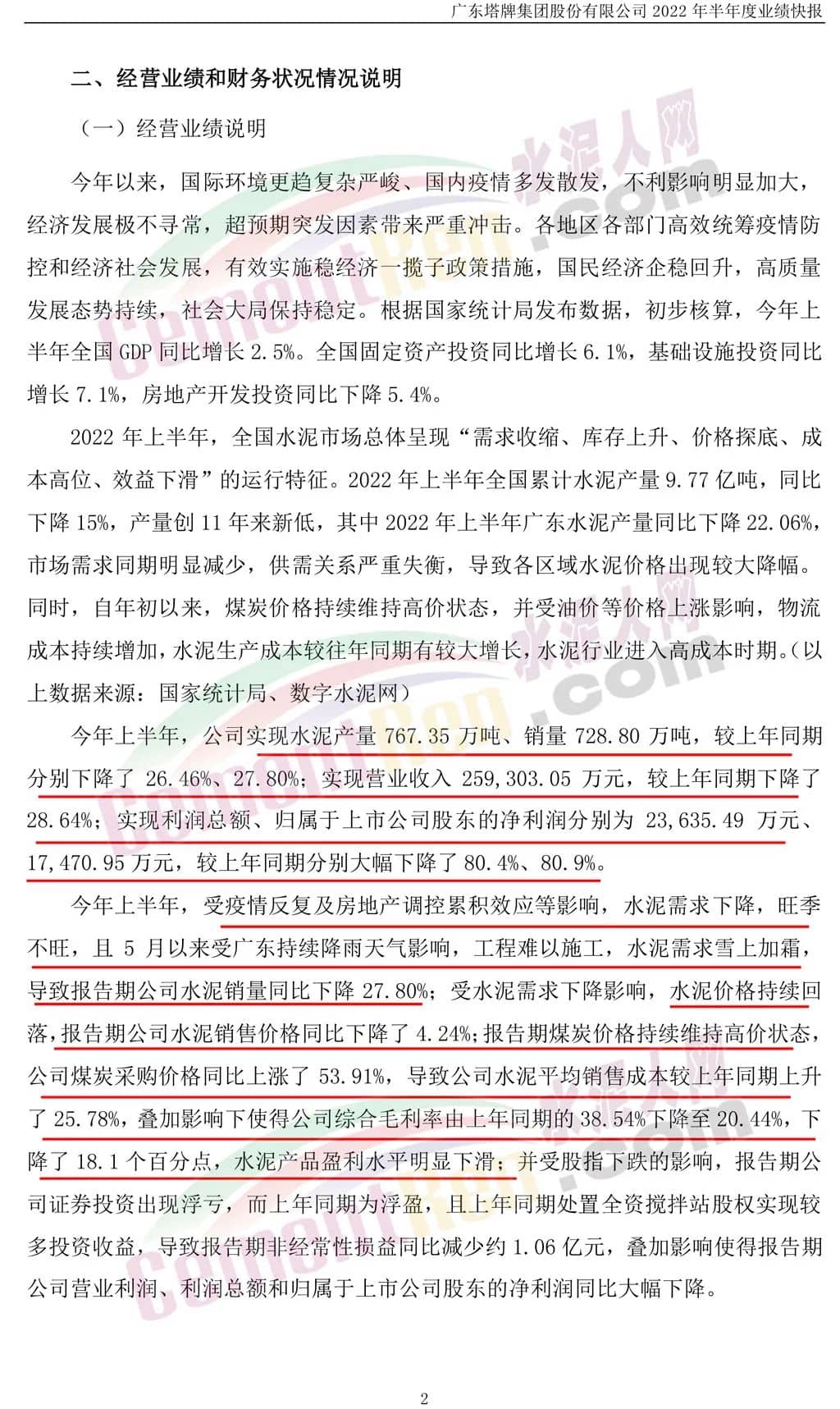 今年上半年,受疫情反復及房地產(chǎn)調(diào)控累積效應等影響,水泥需求下降,旺季不旺,且5月以來受廣東持續(xù)降雨天氣影響,工程難以施工,水泥需求雪上加霜,導致報告期公司水泥銷量同比下降27.80%;受水泥需求下降影響,水泥價格持續(xù)回落,報告期公司水泥銷售價格同比下降了4.24%;報告期煤炭價格持續(xù)維持高價狀態(tài),導致公司水泥平均銷售成本較上年同期上升了25.78%。
