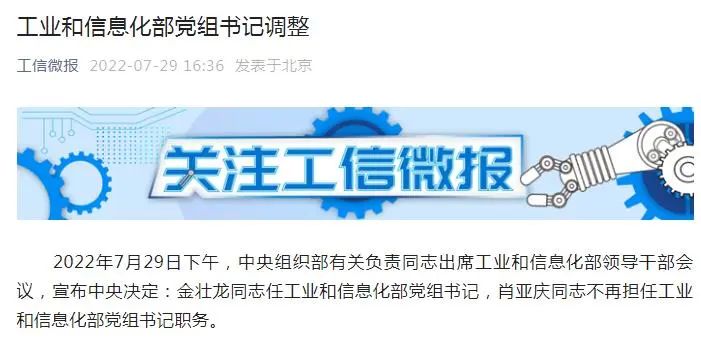 據(jù)工信部官方微信消息,2022年7月29日下午,中央組織部有關(guān)負(fù)責(zé)同志出席工業(yè)和信息化部領(lǐng)導(dǎo)干部會(huì)議,宣布中央決定:金壯龍同志任工業(yè)和信息化部黨組書記,肖亞慶同志不再擔(dān)任工業(yè)和信息化部黨組書記職務(wù)。