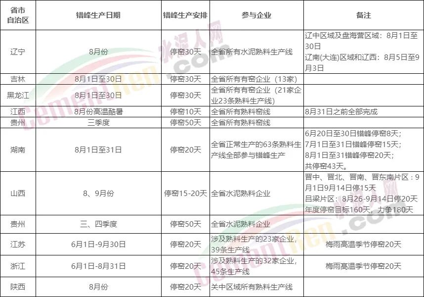 盤點近來發布錯峰生產的省市自治區,部分8-9月份處于停窯的區域時間安排如下: