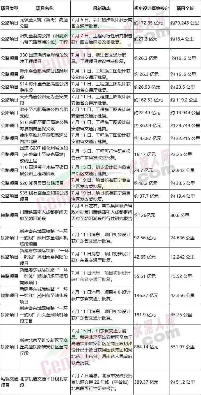 據(jù)水泥人網(wǎng)了解,自 7 月份以來(lái),各省市發(fā)改委、交通運(yùn)輸廳累計(jì)批復(fù)了 12 項(xiàng)公路項(xiàng)目、7 項(xiàng)鐵路工程以及 1 項(xiàng)城軌交通項(xiàng)目,批復(fù)內(nèi)容包括工程可行性研究報(bào)告、初步設(shè)計(jì)以及項(xiàng)目立項(xiàng)核準(zhǔn),各類項(xiàng)目總投資額分別為 646 億元、1499 億元和 389 億元,合計(jì)總投資額 2534 億元。具體的項(xiàng)目批復(fù)情況如下: