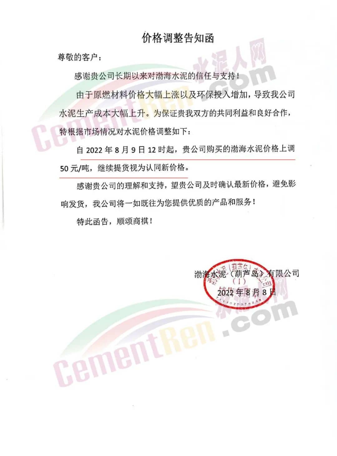 渤海水泥(葫蘆島)有限公司價格調整告知函稱,由于原燃材料價格大幅上漲以及環保投入增加,導致公司水泥生產成本大幅上升,根據市場情況自8月9日12時起,渤海水泥價格上調50元/噸,繼續提貨視為認同新價格。