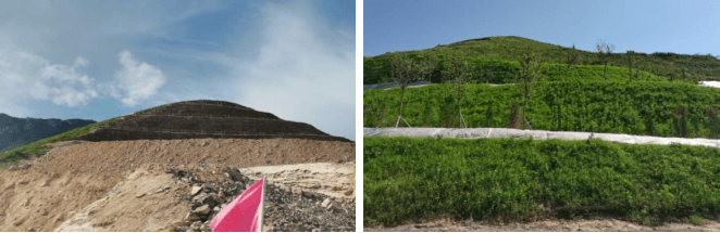 為此,芷蘭生態首先對嵯峨山項目區附近的鄉土植物進行了調研,再運回公司基地進行篩選與培育,并對喬、灌、草進行配比,最后采用“三網一板一巢”的工藝技術,對其進行修復,如下是修復前后的對比圖。