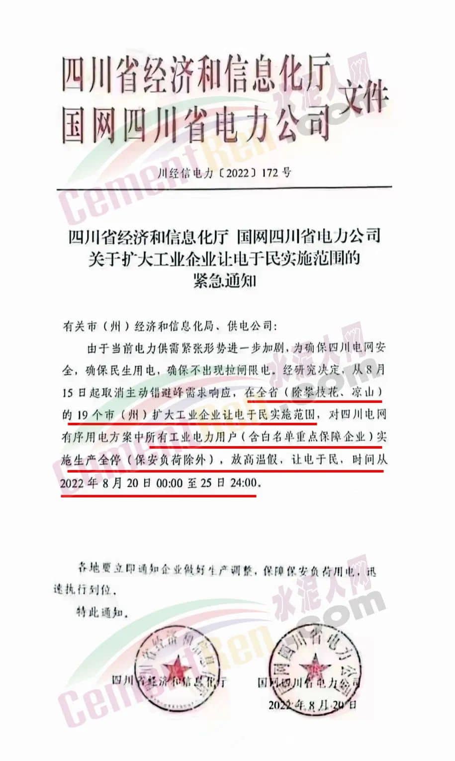 與此同時,區(qū)域內(nèi)水泥行業(yè)主要品牌企業(yè)通知因不可抗力停產(chǎn),水泥無法保障供應(yīng)。有企業(yè)發(fā)公告稱綿陽、廣安基地大規(guī)模生產(chǎn)限電的時間累計將達(dá)到11天,對公司的經(jīng)營業(yè)績造成一定不利影響。