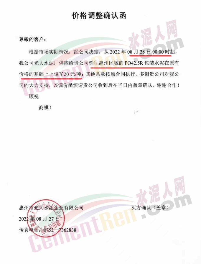 水泥人網消息:惠州光大水泥通知自8月28日0時起銷往廣東惠州區域的P.O42.5包裝水泥上調20元/噸。