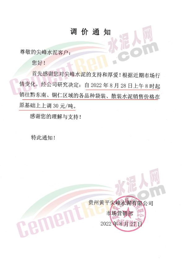 同日,貴州區域多家企業通知上調水泥價格。黃平尖峰水泥通知自8月28日上午8時起銷往黔東南、銅仁區域水泥價格上 調30元/噸。