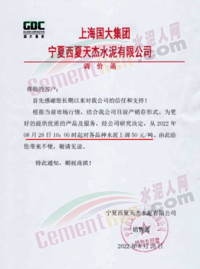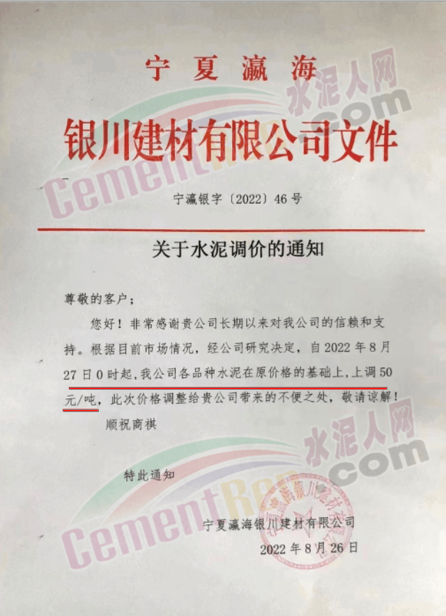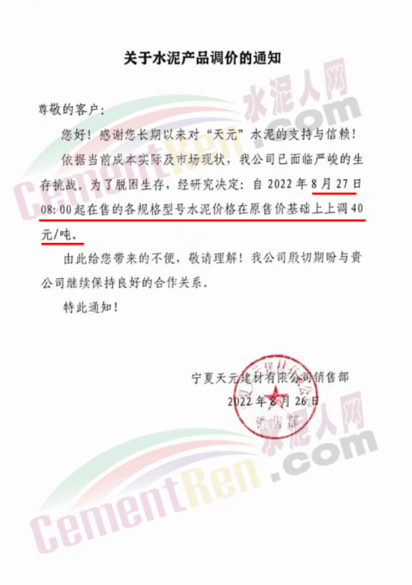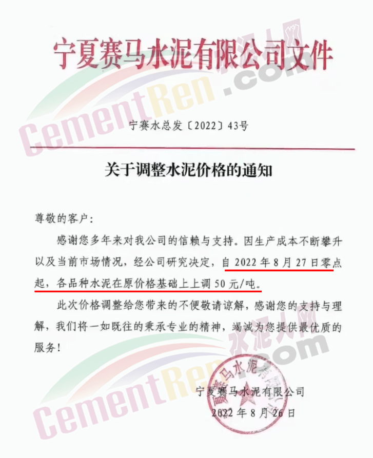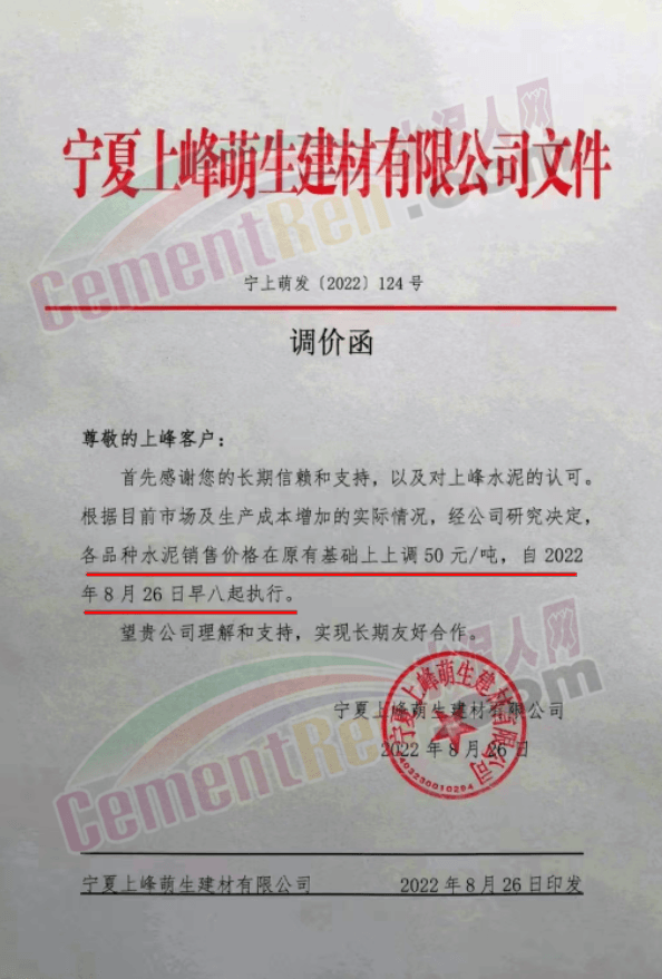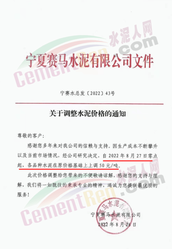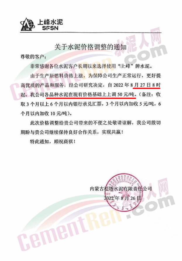 內蒙古松塔水泥通知,8月27日8時起各品種水泥價格上調50元/噸。