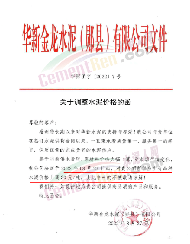 位于湖北省十堰市的華新金龍水泥(鄖縣)公司通知,鑒于當前供電緊張、原材料價格大幅上漲,及市場行情變化,公司決定于2022年08月27日起,對所有品種水泥價格上調30元/噸。