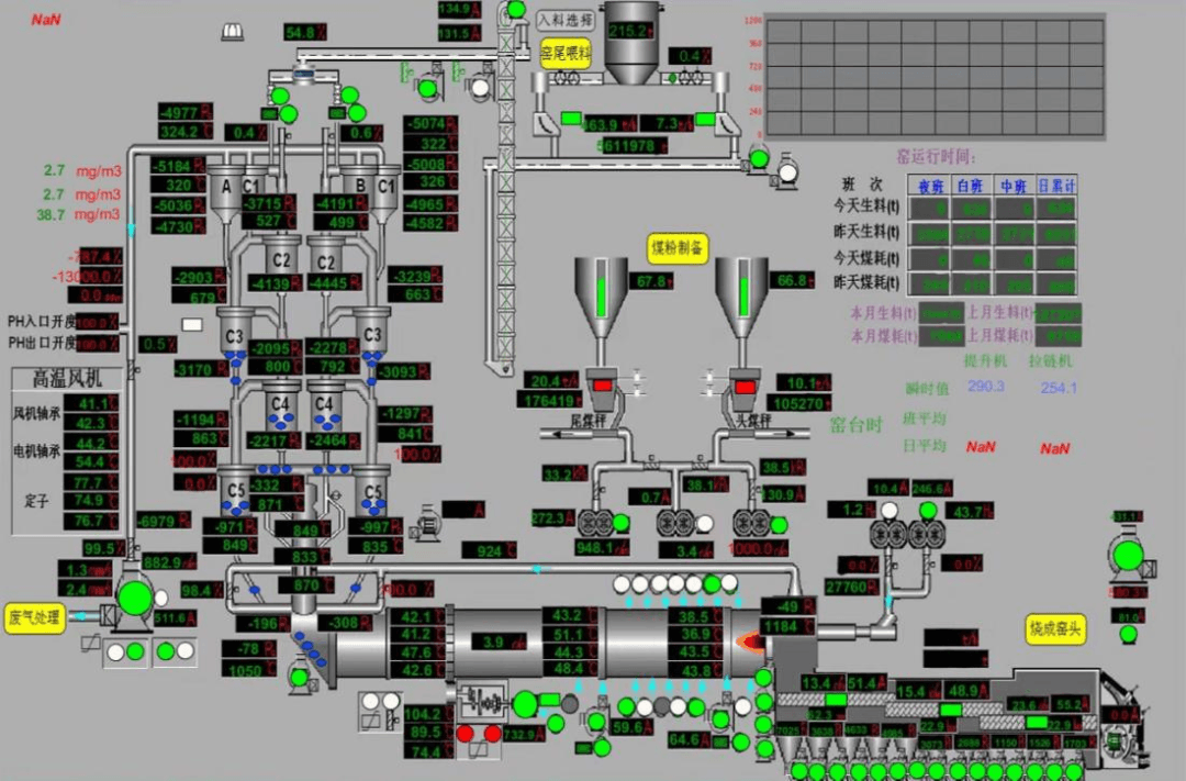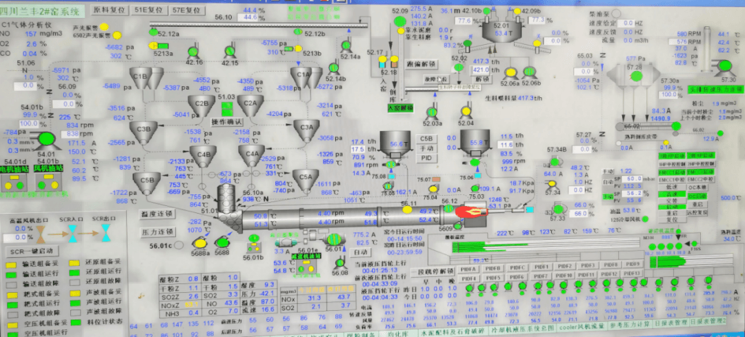 最近的一條標準設計的5000t/d生產線,在兩年前就全部打開三次風管閥門運行的基礎上,采用了“節能型低氮燃燒器”,把噴煤管定位在中心線以上進行運行,再次取得了降低熱耗,提高產量,提高熟料強度,降低高溫風機轉速和電流的明顯效果。并且在產量達到7000t/d的工況下,一級旋風筒出口的壓力只有5000pa。創造了同類型同規格預熱器的最低壓力和最低的熱耗。該生產線的運行界面如下: