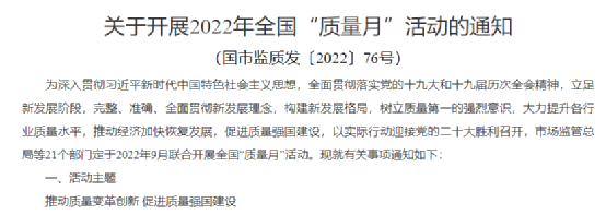 日前,國(guó)家市場(chǎng)監(jiān)管總局發(fā)布《關(guān)于開(kāi)展2022年全國(guó)“質(zhì)量月”活動(dòng)的通知》(國(guó)市監(jiān)質(zhì)發(fā)〔2022〕76號(hào))提到,市場(chǎng)監(jiān)管總局等21個(gè)部門(mén)定于2022年9月聯(lián)合開(kāi)展全國(guó)“質(zhì)量月”活動(dòng)。活動(dòng)主題為“推動(dòng)質(zhì)量變革創(chuàng)新 促進(jìn)質(zhì)量強(qiáng)國(guó)建設(shè)”。