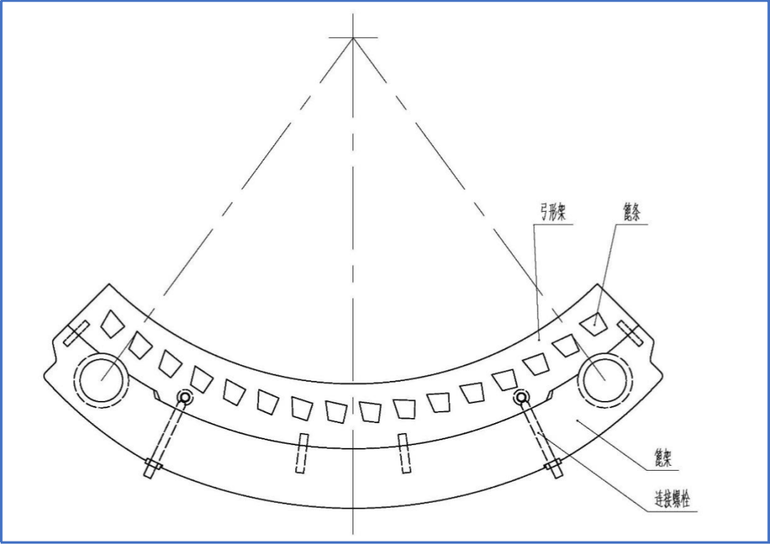 如圖1所示,篦架上部分由弓形架、篦條、連接螺栓等部分組成。其中弓形架為t=30mm的鋼板下料而成。弓形架的外圓與篦架的內圓相配合、定位,再通過連接螺栓固定弓形架。弓形架側面有梯形孔,通長的鍛件篦條從四片弓形架的梯形孔中穿過,端面再以鋼板焊接形式封堵。