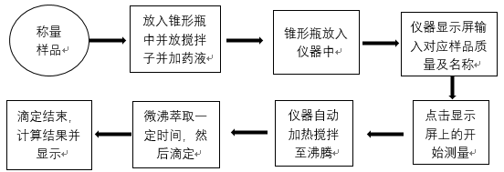 稱量一定量的樣品,將其倒入150ml錐形瓶中,加上30ml的乙二醇-無水乙醇溶液,放入攪拌子,然后放入儀器中對應位置,裝上冷凝管,使得錐形瓶與冷凝管緊密連接,在儀器顯示屏對應的位置輸入稱取的樣品質量及樣品名稱,點擊開始測量,儀器會自動進行攪拌、加熱、萃取、滴定及結果計算,如圖2。