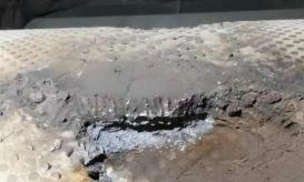 2、輥套母體表層崩損,輥壓機系統運行中使用除鐵裝置已成標配,不可否認的是部分企業在生產運行中該設備形同擺設也是存在的,而系統中進入不吸磁鐵件也為常事,因輥套母體為鍛造而成,整體強度稍顯不足,很容易在進入鐵體時將母材表層崩損,如不及時修復短時間內會使崩損點像堆焊輥套那樣造成往深處磨損及周邊擴展的問題發生。
