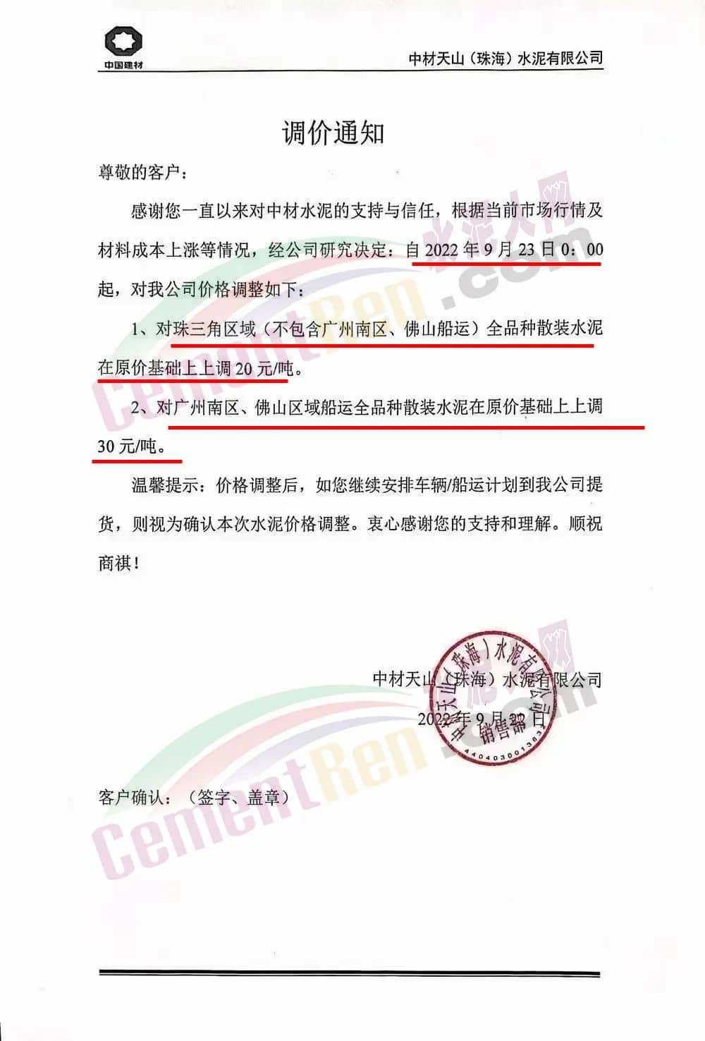 中材天山(云浮)水泥有限公司、中材天山(珠海)水泥有限公司等通知,自9月23日0時起對珠三角區域不包括廣州南區和佛山船運,全品種散裝水泥在原價基礎上上調20元/噸。對廣州南區、佛山區域船運全品種散裝水泥上調30元/噸。