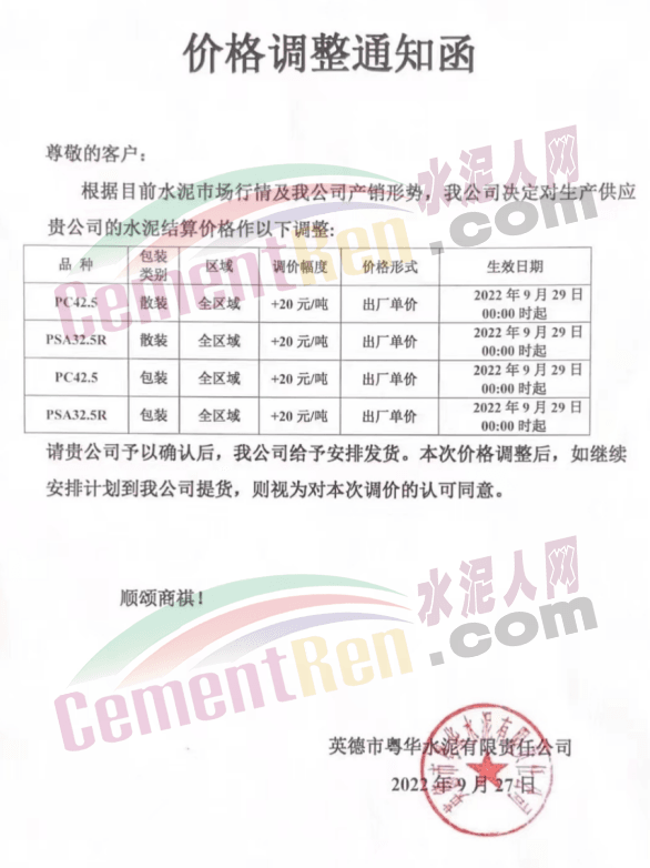佛岡縣金峰水泥有限公司發(fā)布通知稱:因原材料市場價格變動,從2022年9月28日00:00起,我司所有品牌PO42.5R水泥、PP32.5R水泥原價格基礎(chǔ)上上調(diào)20元/噸。