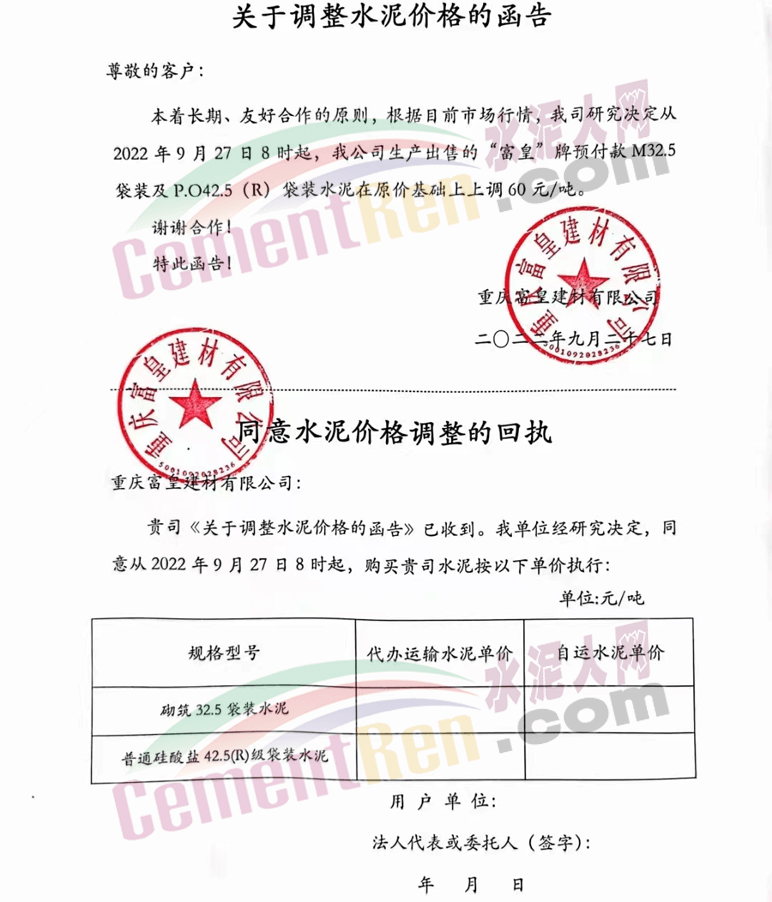 重慶市富豐水泥集團特種水泥有限公司發(fā)布通知稱:根據(jù)目前市場行情變化,經(jīng)我司研究決定,從2022年9月27日早上8:00起,供應貴公司各型號水泥出廠價格在原基礎(chǔ)上上調(diào)60元/噸。