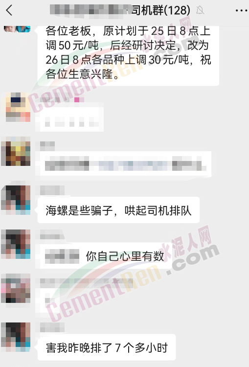 近來多區域水泥價格上漲,個別企業的營銷政策變動較大,下游經銷商和司機多有抱怨。有司機在群里說:“海螺是騙子,害我排了7個多小時。 ”