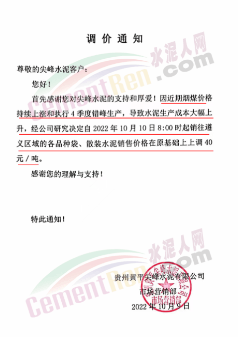 貴州黃平尖峰水泥通知,因近期煙煤價格持續上漲和執行4季度錯峰生產,導致水泥生產成本大幅上升,經公司研究決定自10月10日起銷往黔南、黔東南以及遵義區域的各品種水泥價格上調40元/噸。