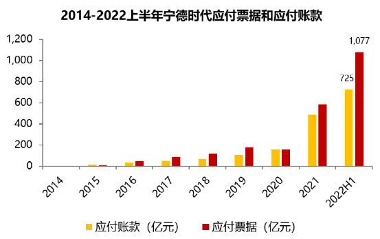 面對營業(yè)成本的快速上升和不斷擴(kuò)大的產(chǎn)能,寧德時(shí)代資金支付需求快速上升。企業(yè)對供應(yīng)商的欠款一般在資產(chǎn)負(fù)債表中計(jì)入應(yīng)付賬款和應(yīng)付票據(jù)項(xiàng)目中,寧德時(shí)代2012-2022上半年應(yīng)付賬款和應(yīng)付票據(jù)變化情況如下: