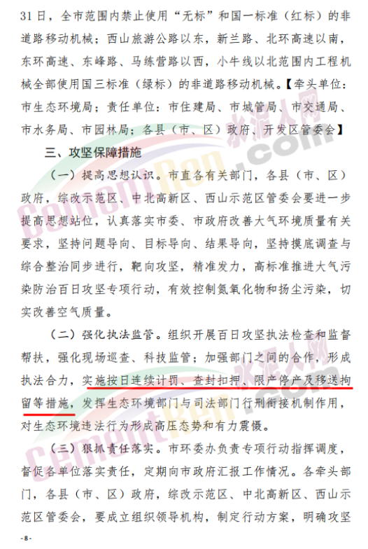 攻堅保障措施不僅要求強化執法監管。實施按日連續計罰、查封扣押、限產停產及移送拘留等措施,發揮生態環境部門與司法部門行刑銜接機制作用,對生態環境違法行為形成高壓態勢和有力震懾。同時,強化輿論引導。由市委宣傳部牽頭,緊緊圍繞全市大氣污染防治工作,開展形式多樣的環境保護宣傳活動,提升全民環境保護意識。充分發揮媒體作用,及時曝光突出環境問題和整改情況。完善監督舉報、環境公益訴訟等機制,鼓勵和引導環保社會組織和公眾參與大氣污染監督治理。