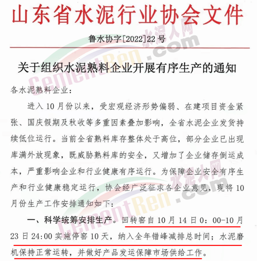 日前,山東水泥熟料企業收到通知,要求所有水泥熟料生產線企業自10月14日0時起至10月23日24時實施停窯10天,納入全年錯峰減排總時間。