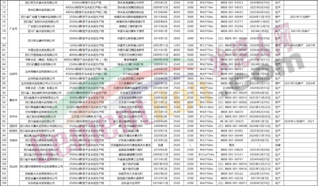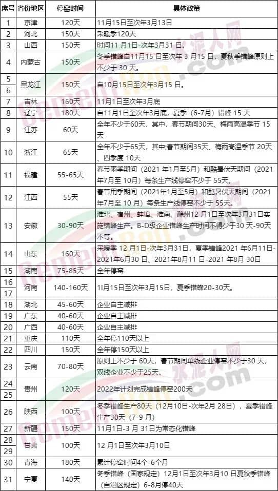 按照各區域常態化錯峰生產的要求京津冀、山西、內蒙古、遼寧、吉林、黑龍江、山東、河南、重慶、四川、貴州、新疆、寧夏、青海、陜西、甘肅等近二十個省市地區全年停窯時間都超過了100天,在冬季采暖季有近千條熟料生產線集體停產。