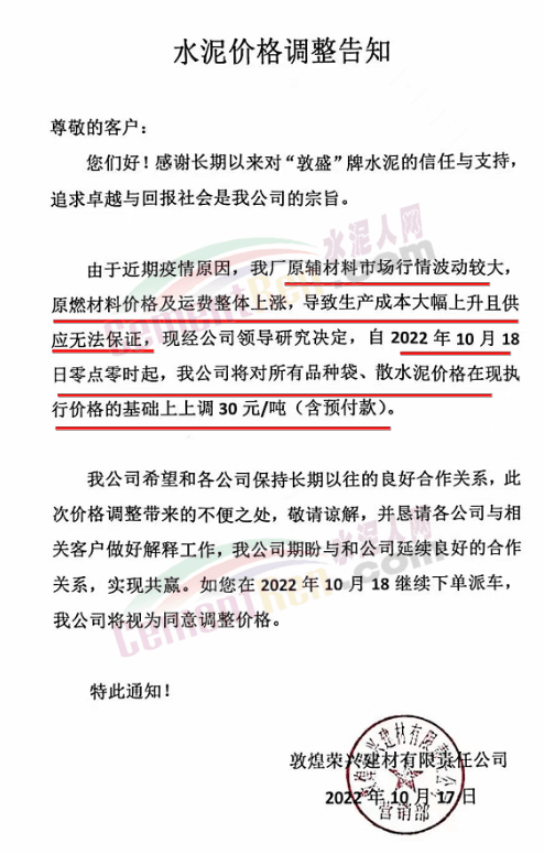水泥人網通訊員消息:10月17日,甘肅酒泉敦煌榮興建材有限責任公司通知,由于近期疫情原因,工廠原輔材料市場行情波動較大,原燃材料價格及運費整體上漲,導致生產成本大幅上升且供應無法保證,現經公司領導研究決定,自2022年10月18日零點零時起,公司將對所有品種袋、散水泥價格在現執行價格的基礎上上調30元/噸(含預付款)。