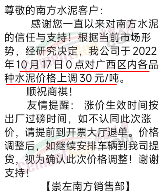 崇左南方銷售部通知,根據當前市場形勢,經研究決定公司于10月17日0點對廣西區域各品種水泥價格上調30元/噸。