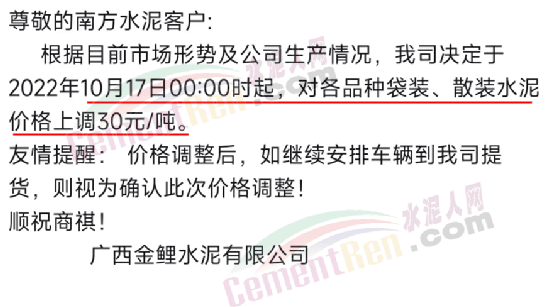 廣西金鯉水泥通知10月17日0時起,對各品種袋裝、散裝水泥價格上調30元/噸。