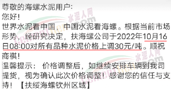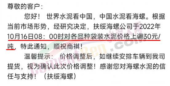 扶綏海螺欽州區域通知10月16日8時起,所有品種水泥價格上調30元/噸。