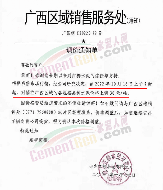 崇左紅獅水泥有限公司廣西區域銷售服務處通知,自10月16日上午7時起,對銷往廣西區域的各規格品種水泥價格上調30元/噸。