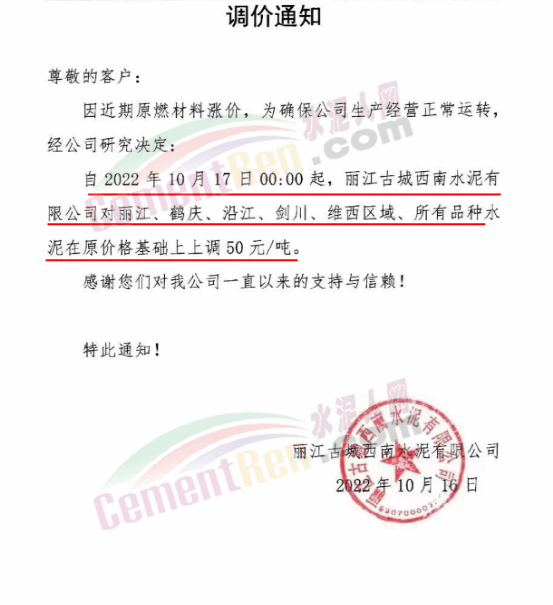 麗江古城西南水泥通知10月17日0時起,麗江古城西南水泥有限公司對麗江、鶴慶、沿江、劍川、維西區域所有品種水泥價格上調50元/噸。