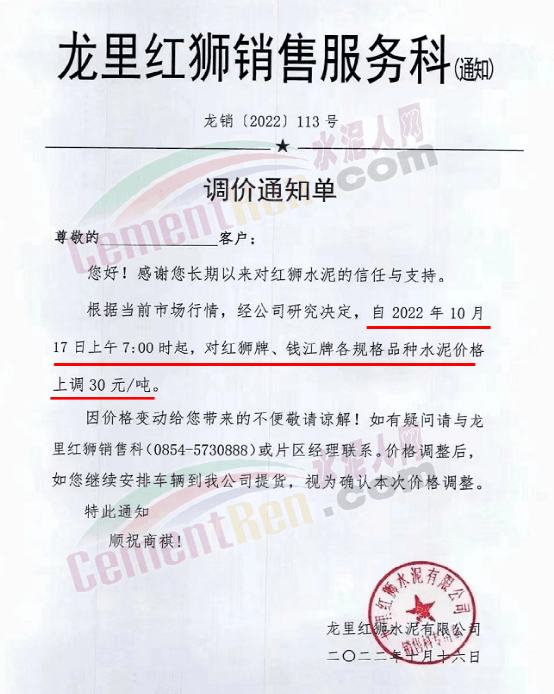 龍里紅獅水泥有限公司通知,10月17日上午7時起,對紅獅牌、錢江牌各規格品種水泥價格上調30元/噸。