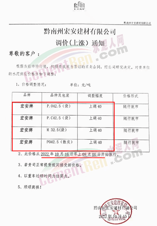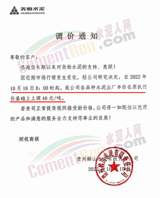 貴州麟山水泥有限公司通知,自10月16日0時起,公司各品種水泥出廠單位在原執行價格基礎上上調40元/噸。